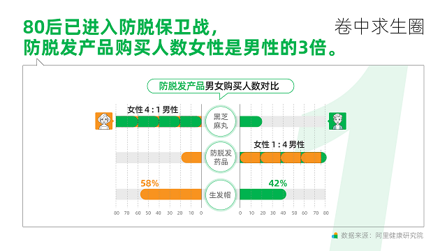 洞察顯示,當(dāng)代職場人普遍存在脫發(fā)焦慮和睡眠焦慮,80后進(jìn)入“防脫保衛(wèi)戰(zhàn)”,意想不到的是,在防脫發(fā)產(chǎn)品購買人數(shù)上女性是男性的3倍。