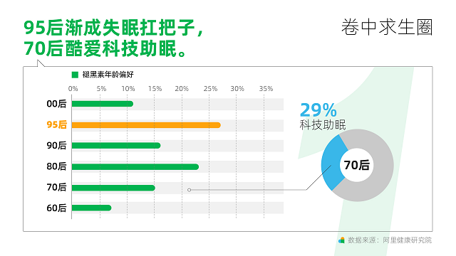 另一個(gè)困擾職場人的就是睡不夠的覺。《洞察》顯示,睡眠產(chǎn)品2021年銷量同比2020年上漲220%,其中六成睡眠產(chǎn)品由女性購買。2021年褪黑素三成銷量來自95后,95后成為失眠扛把子,而70后更偏愛科技助眠,更多選擇購買新奇的睡眠產(chǎn)品:如失眠貼、睡眠儀等。