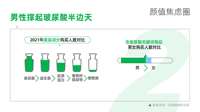 另外,《洞察》發(fā)現(xiàn),80后是所有美容成分的絕對忠粉,在含“玻尿酸”關(guān)鍵詞商品的消費(fèi)上,男性人數(shù)正在趕超女性。愛美的00后不甘落后,更偏好葡萄籽提取物。