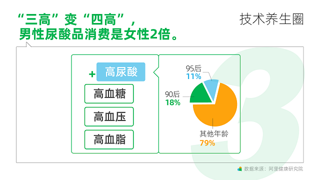 《洞察》發(fā)現(xiàn),尿酸儀正繼血壓計(jì)、血糖儀,逐漸成為居家自測的必備黑科技產(chǎn)品。2021年購買智能尿酸儀的男性是女性的2倍,而且消費(fèi)者日益呈現(xiàn)年輕化趨勢,90后和95后各占18%、11%。