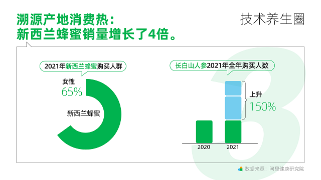 當(dāng)然對于技術(shù)養(yǎng)生流來說,除了對黑科技產(chǎn)品的研究,對源頭好貨的追求也是相當(dāng)執(zhí)著,寧夏紅枸杞、青海黑枸杞、山東東阿膠……2021年原產(chǎn)地滋補(bǔ)品銷量同比2020年增長60%,新西蘭蜂蜜原產(chǎn)地品牌銷量增長了4倍,長白山人參源頭品牌2021年全年購買人數(shù)上升150%。