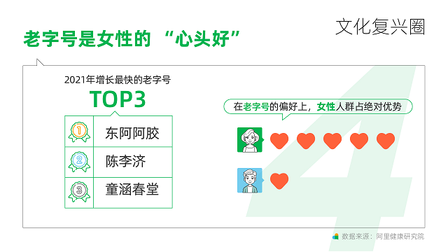 除此之外,年輕人對老字號品牌也有偏好,銷量增長最快的三大老字號品牌是:東阿阿膠、陳李濟(jì)、童涵春堂。女性相比男性更偏好老字號品牌的養(yǎng)生產(chǎn)品。