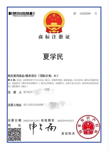 從國家知識產(chǎn)權(quán)局官方網(wǎng)站查詢可知,注冊人為夏學(xué)民,注冊人地址位于杭州市西湖區(qū)。他把自己的姓名“夏學(xué)民”注冊在第41大類,內(nèi)容涉及培訓(xùn)、語言培訓(xùn)、安排和組織學(xué)術(shù)討論會(huì);就業(yè)指導(dǎo)(教育或培訓(xùn)顧問)、提供在線教育信息;配音、文稿撰寫、攝影報(bào)道、新聞?dòng)浾叻⻊?wù)等。國家知識產(chǎn)權(quán)局已依法授予其10年商標(biāo)權(quán)(2022年9月14日至2032年9月13日)。