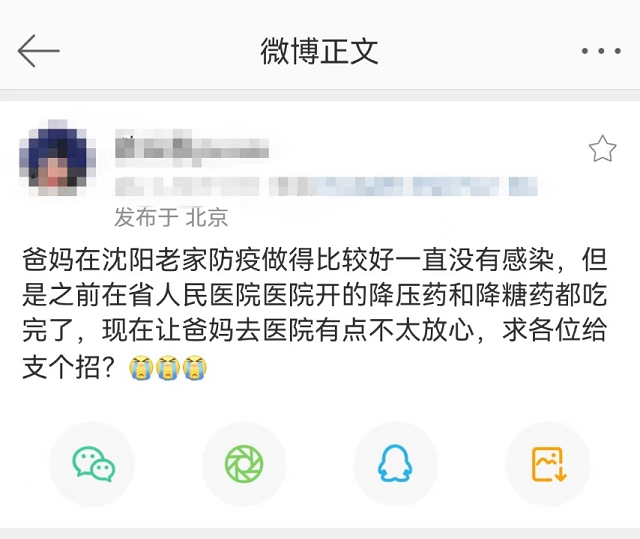 “爸媽在沈陽老家防疫做得比較好一直沒有感染,但是之前在省人民醫(yī)院醫(yī)院開的降壓藥和降糖藥都吃完了,現(xiàn)在讓爸媽去醫(yī)院有點不太放心,求各位給支個招?”