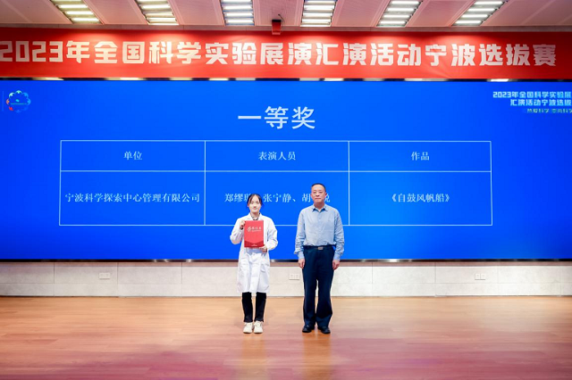 經(jīng)過一天扣人心弦的激烈比拚,最后,寧波科學(xué)探索中心管理有限公司鄭繆璇、張寧?kù)o、胡馨悅代表隊(duì)作品《自鼓風(fēng)帆船》力壓群雄,以95.33分的三年以來全場(chǎng)最高分拔得頭籌,榮獲2023年全國(guó)科學(xué)實(shí)驗(yàn)展演匯演活動(dòng)寧波選拔賽第一名,榮膺一等獎(jiǎng)。