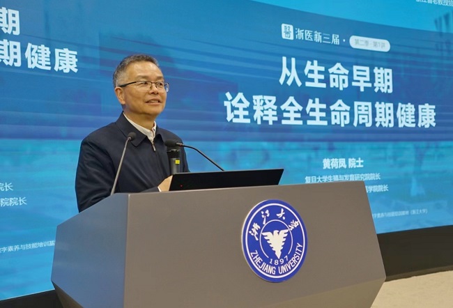 中國(guó)科學(xué)院院士、復(fù)旦大學(xué)生殖與發(fā)育研究院院長(zhǎng)、浙江大學(xué)“一帶一路”國(guó)際醫(yī)學(xué)院院長(zhǎng)黃荷鳳作了《從生命早期詮釋全生命周期健康》科普?qǐng)?bào)告。杭州市西湖區(qū)三墩鎮(zhèn)水秀苑社區(qū)黨總支書(shū)記梁小平組織社區(qū)居民走進(jìn)浙江大學(xué)紫金港校區(qū)智云報(bào)告廳,面對(duì)面聆聽(tīng)黃院士講課。