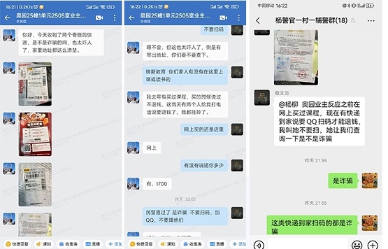 “你好,今天收到兩個奇怪的快遞,是不是詐騙的。恳蔡珖樔肆,家里地址都這么清楚。”1月18日16時22分,杭州市蕭山區(qū)蜀山派出所駐村輔警在企業(yè)微信上收到北辰奧園租戶的詢問,疑似有被騙風(fēng)險。駐村輔警了解情況后立即告知該業(yè)主不要繼續(xù)進行操作,同時與社區(qū)民警確認是詐騙后,第一時間上門拆除該“詐彈”。