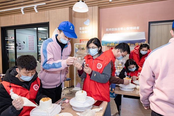 “老師,可以幫助一下我嗎?”紅十三愛心社的志愿者在“壹星釀”孤獨癥青年就業(yè)實踐基地里接受孤獨癥知識培訓(xùn),并學(xué)習(xí)制作愛心蛋糕、打包盒?此坪唵蔚牟襟E卻總是手忙腳亂,館內(nèi)的孤獨癥工作人員會立馬成為小老師,非常麻利地提供指導(dǎo)幫助。每一次的求助,志愿者們都有一句完整的“謝謝!”,當(dāng)然也會得到一句完整的回應(yīng)“不客氣!”館內(nèi)的孤獨癥指導(dǎo)師總是鼓勵小老師們認(rèn)真對待每一次互動和溝通,長期的工作體驗和社交訓(xùn)練,他們的能力在孤獨癥患兒中已是拔尖。其中一名工齡4年的服務(wù)員小谷,已經(jīng)完全獨立生活了。