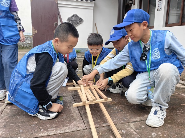 學(xué)完相關(guān)知識后,孩子對接下來的“搭建魯班橋”環(huán)節(jié)充滿期待。不費一滴膠,不用一顆釘,只用幾根木頭就能搭建出一座橋。孩子們帶著好奇心,幾人一組,相互配合!拔覀兇畛鰜砝!”一些小朋友在經(jīng)過老師的簡單指點后,成功搭建出“魯班橋”,興奮地向大家展示成果。隨后,老師一邊為大家進行專業(yè)示范,一邊講解相關(guān)知識,帶領(lǐng)大家深度學(xué)習(xí)中國古建的內(nèi)部結(jié)構(gòu)、力學(xué)原理,科學(xué)探索榫卯結(jié)構(gòu)的奧秘。