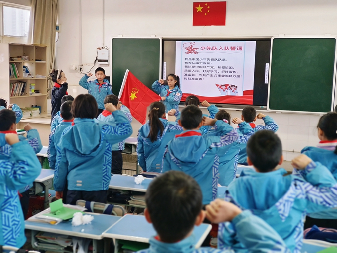 隨著隊(duì)歌的響起,學(xué)生們右手緊握成拳,莊嚴(yán)地重溫了少先隊(duì)員的入隊(duì)誓詞。