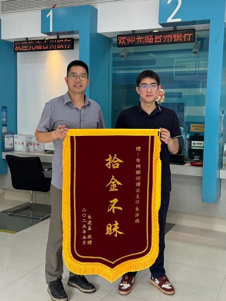 當(dāng)失主見到完好無(wú)損的物品時(shí),激動(dòng)不已。這些設(shè)備不僅價(jià)值不菲,更存儲(chǔ)著重要工作資料和個(gè)人珍貴記憶。失主緊握朱澤鵬的雙手連聲道謝,并詢問其姓名與單位,盛贊其“拾金不昧,品德高尚”。5月29日,心懷感激的失主專程前往臺(tái)州銀行麗水縉云支行,向朱澤鵬贈(zèng)送“拾金不昧”錦旗,對(duì)其展現(xiàn)的職業(yè)素養(yǎng)和社會(huì)責(zé)任感給予高度評(píng)價(jià)。
