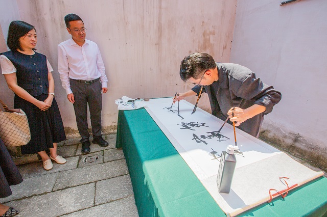 活動(dòng)現(xiàn)場,悠揚(yáng)古琴聲緩緩流淌,拉開文化盛宴的帷幕。隨后,中國當(dāng)代著名書法家葉根友現(xiàn)場揮毫潑墨,以筆墨丹青展現(xiàn)甌越書畫魅力,展露書畫藝術(shù)在基層沃土扎根生長之姿。