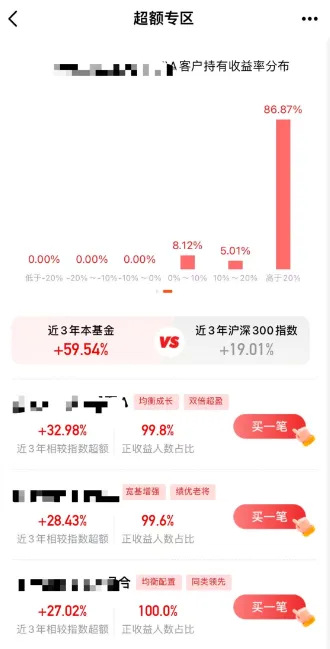 例如,天天基金上線了超額專區(qū),基于基準占比、指數(shù)相關(guān)性、超額收益、運作穩(wěn)定性、投研支持這五大維度,篩選具備持續(xù)超額收益潛力的產(chǎn)品。并且,這一專區(qū)突出了投資者的真實盈利情況,直觀呈現(xiàn)持倉用戶盈利占比與平均收益率,將產(chǎn)品的價值與投資者獲得感直接掛鉤。